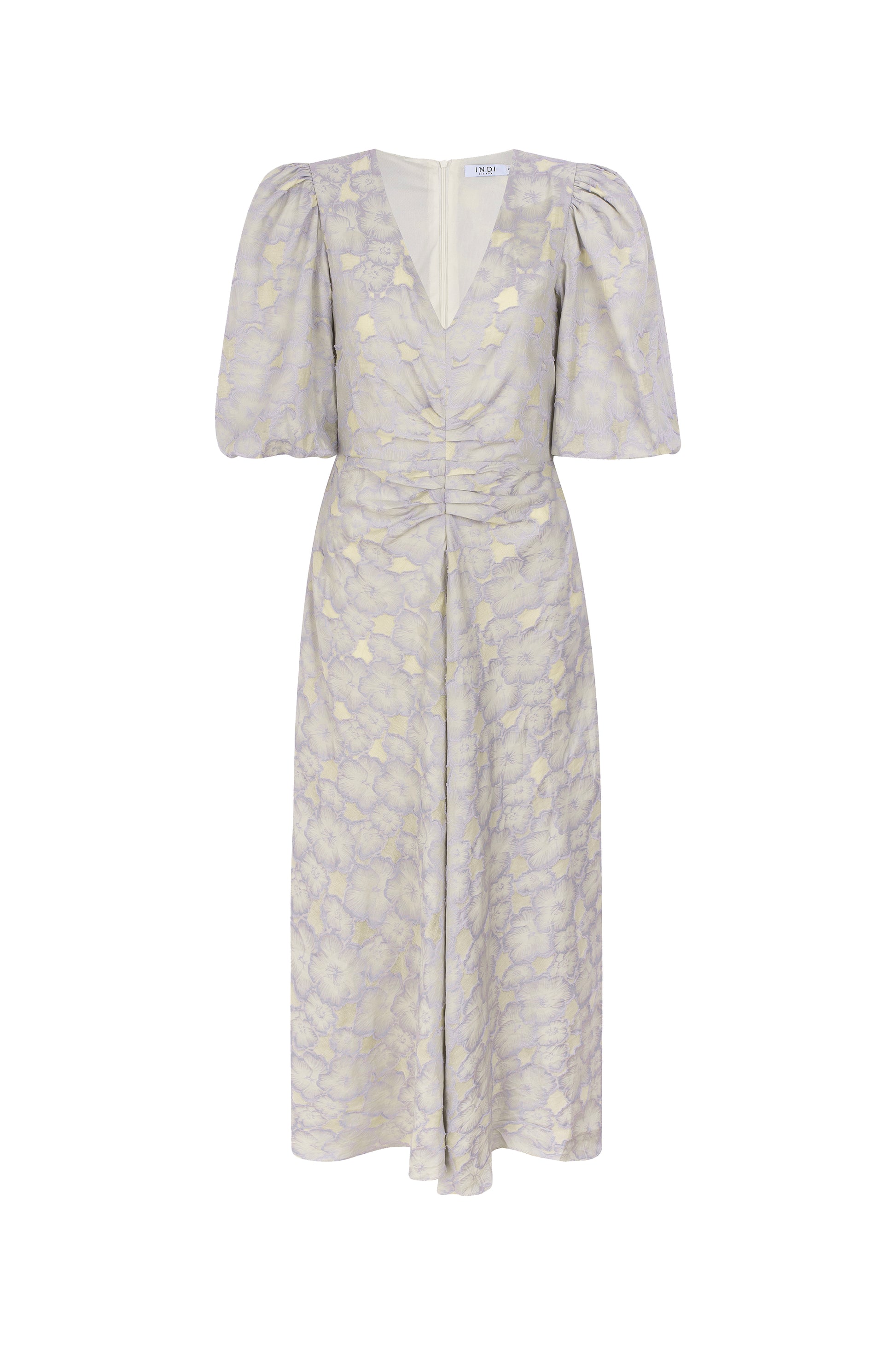Vestido com padrão floral amarelo e lilás. Aperta com fecho nas costas. Mangas abaloadas. Corte cintado com saia fluída.